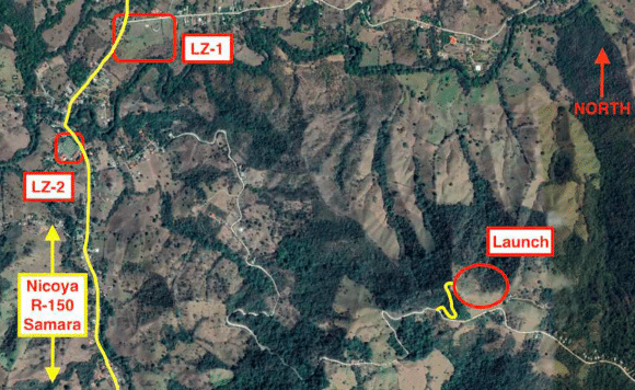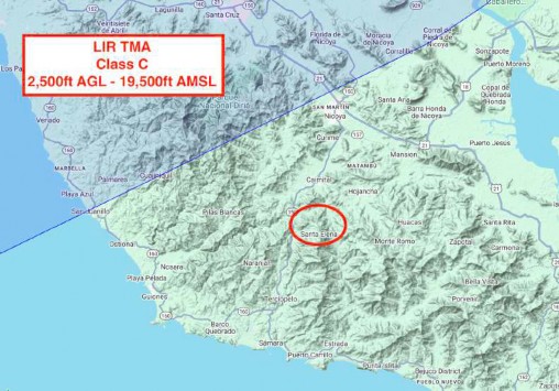 Hay un espacio aéreo relevante en la zona. El TMA del aeropuerto de Liberia (MRLB) es espacio aéreo clase C y se extiende en una franja justo al norte de Nicoya hasta San Juanillo, en la costa. El límite inferior es 2500 ft AGL (760 m), lo que significa que en las montañas aún se puede volar hasta unos 1700 m (5500 ft), pero en zonas más bajas al norte del Parque Nacional Diriá este límite puede ser bastante restrictivo. Muchos sitios web no tienen bien definido el espacio aéreo de Costa Rica, por lo que incursiones accidentales no suelen afectar reclamos XC. Aun así, hay bastante tráfico local volando en planes IFR hacia Liberia, a altitudes similares, y no esperan encontrar parapentes. También es importante considerar la actividad en estos tres aeródromos activos. No tienen restricciones de espacio aéreo, pero conviene estar atentos. Si tiene radio con banda aérea, la frecuencia Unicom es 122.000 MHz.